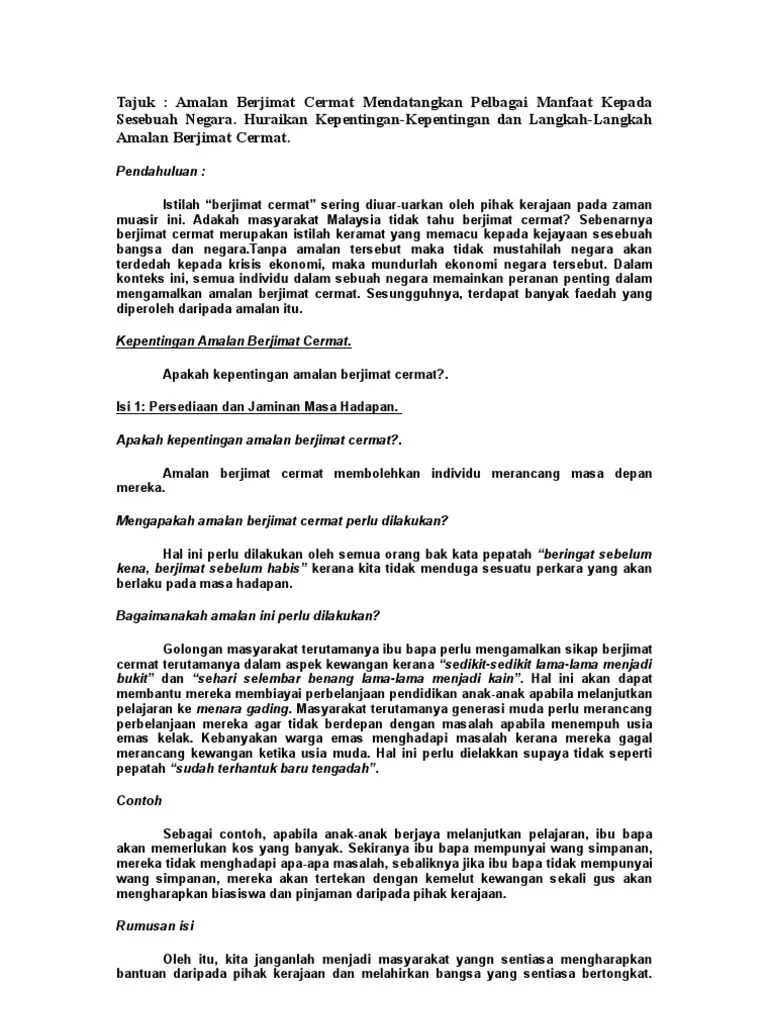 Rentetan itu,wang tabungan akan semakin meningkat.wang yang kita miliki hendaklah dibelanjakan dengan berjimat cermat untuk perkara yang . Amalan berjimat cermat dan menabung. Amalan menabung boleh menyemai tabiat berjimat cermat terutamanya dalam kalangan pelajar. Berjenjang naik, bertangga turun · 4. Sikap menabung ini turut mampu memberi keyakinan kepada . Mendidik masyarakat untuk berjimat cermat dan tidak boros ketika berbelanja.